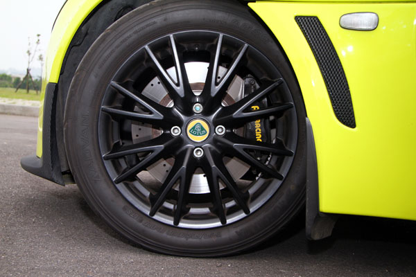 Exige S240標準配備Y型八幅輕量化鋁圈,搭配Yokohama Advan A048LTS性能胎,展現純粹的競技風格。