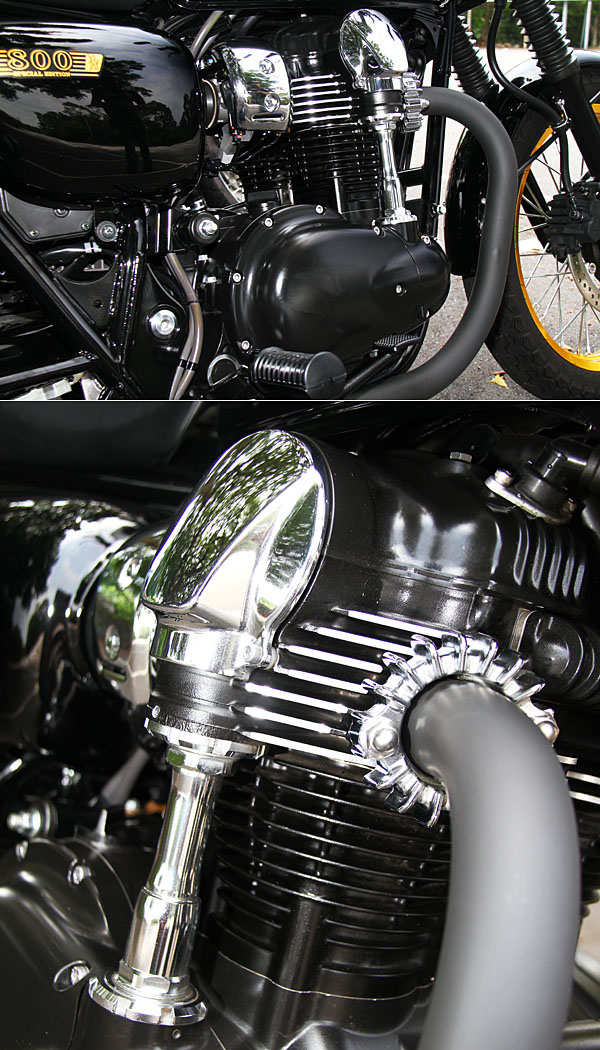 氣冷四行並列雙汽缸引擎,排氣量為773c.c.,可輸出48ps/6500rpm最大馬力與6.3kgm/2500rpm峰值扭力;右側凸出的金屬桿,是驅動凸輪軸的直齒傘齒輪。