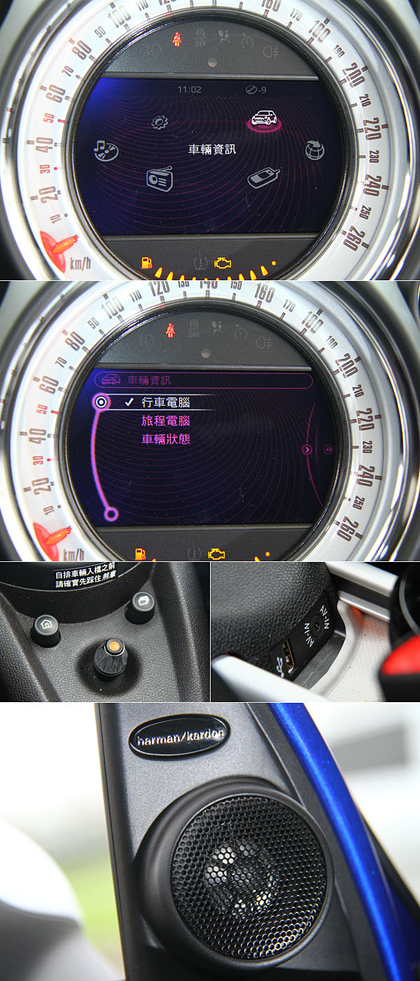Mini Visual Boost 6.5吋繁體中文螢幕,加上藍牙免持行動電話系統含USB插槽與Aux-in外接音源裝置,試駕車輛並選配Harman Kardon高傳真音響系統。