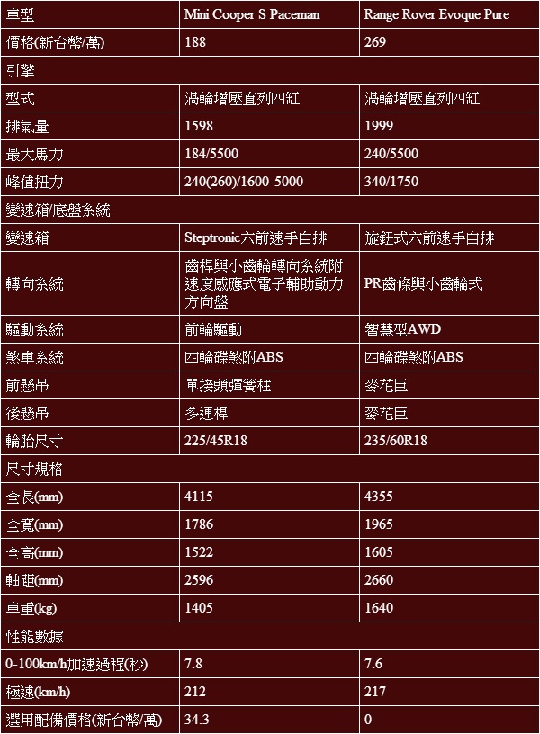 Mini Cooper S Paceman與Range Rover Evoque Coupe基本規格表