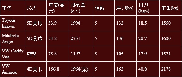 除了上面那些越看越熱血的組別外,其實台灣市場裡還有一群數量龐大但相對不拉風的手排車款,那就是商用車市場,而扣除標準商用車以外,帶點商車色彩的其他車款也不少,像是Toyota Innova、Mitubishi Zinger、VW Caddy Van甚至Amarok都是例子,這些車之所以使用手排,著眼的又回到經濟與耐用等實際面向,也更符合該用車族群的需求。