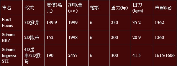 將價位提升到百萬以上,手排車的選擇稍稍變得多了一些,不過趨勢開始往熱血的鋼砲或小跑車板塊移動。在台灣市場,當今最火熱的幾款手排性能車便集中在此,包括已經成名許久的Subaru Impreza STI、甫創造市場話題的後驅小跑Subaru BRZ以及即將上市的前驅鋼砲王Ford Focus ST,都是赫赫有名的性能戰將,無論四驅、後驅或前驅,也都各自有著忠實粉絲擁護著。