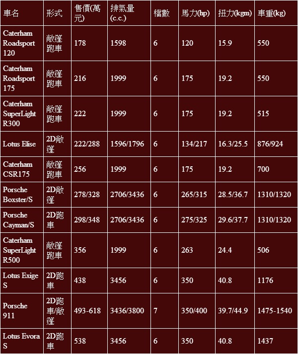 Impreza STI或Focus ST已經很悍了嗎?如果你真這樣以為,顯然小看了市面上仍有許多更純粹以性能為依歸的手排車款,在台灣市場最高級別的手排車組裡,用臥虎藏龍來敘述一點也不為過,包括Lotus、Porsche甚至Caterham,各個都是素負盛名的跑車名門!