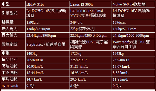 延伸閱讀:【集體評比】不容小覷 ─ 316i vs IS 300h vs S60 T4旗艦版 結論其他對手