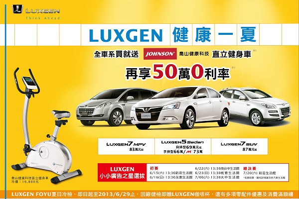 Luxgen為了感謝消費者的支持與熱愛,6/1~6/28入主Luxgen全車系,即贈送喬山直立式健身車(價值16,800元)一部,同時可享有50萬零利率優惠。