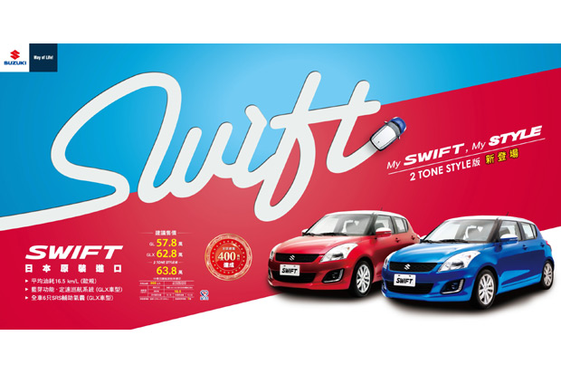 Suzuki Swift自2005年在台灣上市以來,以其動感的外型、並搭配多樣豐富的內裝配備,一上市即掀起小型車市場風潮,於2014年8月,全球銷售量更達成400萬台的里程碑!Taiwan Suzuki為慶祝Swift在台上市將屆滿10週年,推出搶眼新配色的Swift「2 Tone Style版」回饋消費者。