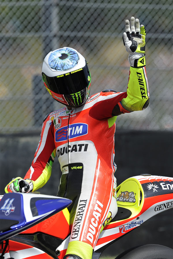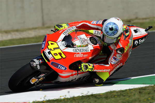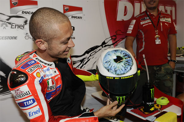 每年的義大利站中,爆滿且瘋狂的羅西迷從不缺席,為了回應這廣大的支持粉絲,Rossi總會與其老友、也是其安全帽設計者Aldo Drudi共同研究全新的主場安全帽彩繪,而今年主題則以Rossi的瞳孔為主,斗大的眼睛往前看,似乎正在說著「我看著你,要來向你挑戰了!」