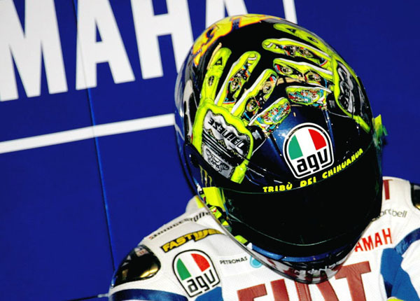 至今曾奪得九座MotoGP賽事冠軍獎盃(7次MotoGP、250c.c./125c.c.各一次)的義大利車手Valentino Rossi,每年於MotoGP的義大利Mugello站時,為了回饋當地的主場車迷,皆會戴著獨一無二的「主場安全帽」現身,今年也不例外,名為〝I see you〞的主題安全帽,頭頂斗大的眼珠,可是完全仿照Rossi的瞳孔彩繪而來!