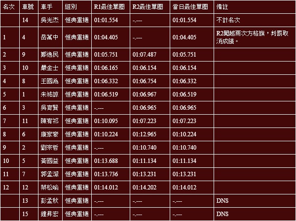 騎乘Suzuki GSX-R 1000的岳萬中在上午做出1分04.405秒的成績,位居所有計算名次的騎士之首。雖然下午由於闖越兩次方格旗的緣故,遭受取消單圈成績的處罰,不過上午的成績已優於所有騎士的成績,拿下恒典重機組的冠軍,為人車事獨走賽寫下新的歷史。另外,分別騎乘Honda CBR 1000RR與Kawasaki ZX10R的鄭逸民語嚴金士也分別做出1分05.751秒與1分06.154秒的成績,位居恒典重機組第2與第3,成績相當不錯。