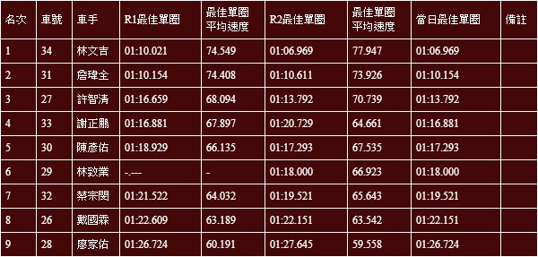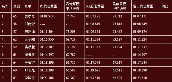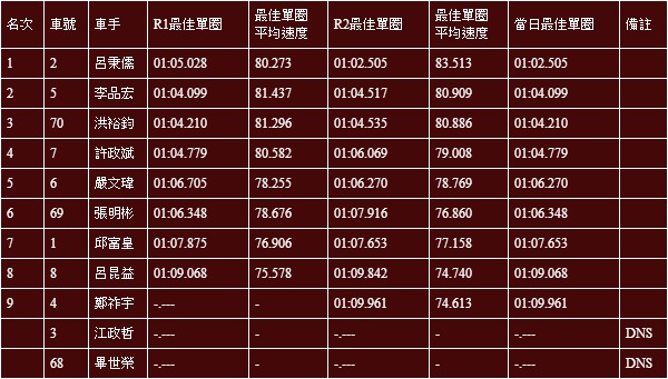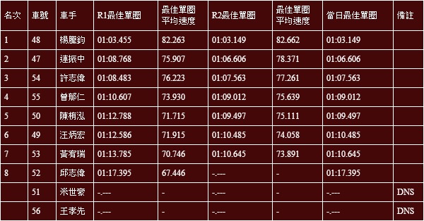 No.8 呂昆益,當日最快單圈01:09.068。