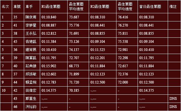 No.1 邱富皇,當日最快單圈01:07.653。