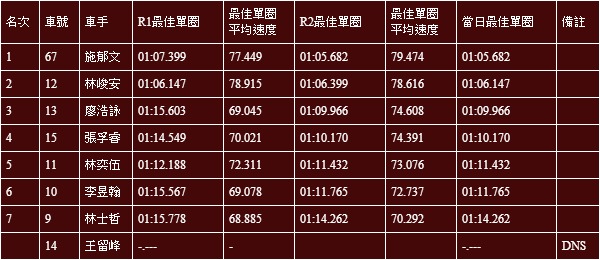 No.67 施郁文,當日最快單圈01:05.682。