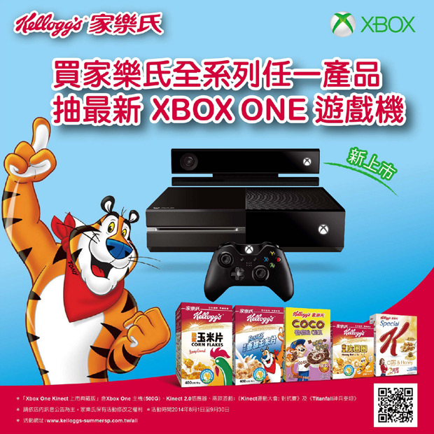 Xbox也與家樂氏合作提供消費者贏得「Xbox One Kinect 上市典藏版」的絕佳良機,消費者於全台各通路(量販店、全聯、超市等)購買家樂氏全系列任一商品(包括家樂氏東尼玉米片、原味玉米片、COCO可可玉米片、Special K香脆麥米片以及什錦果麥等系列),憑購買發票上網登錄,即有機會抽中超搶手的「Xbox One Kinect 上市典藏版」(共20組),喜愛家樂氏產品和Xbox的消費者千萬不可錯過,詳情請見活動網站:www.kelloggs-summersp.com.tw/all
