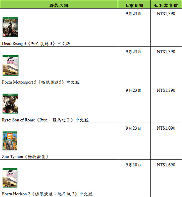 除了超值的「Xbox One Kinect 上市典藏版」,消費者也可搶先預購Xbox One平台的專屬遊戲包括Dead Rising 3《死亡復甦 3》中文版、Forza Motorsport 5 《極限競速5》中文版、Forza Horizon 2《極限競速:地平線 2》中文版、Ryse: Son of Rome 《Ryse:羅馬之子》中文版及Zoo Tycoon《動物樂園》,皆同步於7/31起開放預購。不論是體驗駕馭跑車奔馳賽道的真實感、化身古羅馬戰士投身沙場的豪邁、融入在刺激的殭屍末日、建造屬於自己的野生動物樂園,每一款 Xbox One 獨佔遊戲都提供了讓人渾然忘我的全新娛樂體驗,讓不同類型的玩家一同探索暢玩。