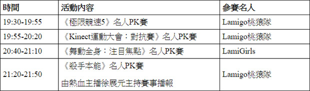 在上市派對當天的活動現場,更將舉辦「Xbox One名人PK賽」,台灣微軟特別邀請到Xbox的忠實粉絲Lamigo桃猿隊選手「大師兄」林智勝、陳禹勳、林泓育等知名球員到場同樂,並且將史無前例公開接受玩家挑戰,與玩家一同較勁包括Kinect Sports: Rivals《Kinect運動大會:對抗賽》及Forza Motorsport 5《極限競速5》等多款遊戲。同時超人氣啦啦隊LamiGirls更將以熱歌勁舞來為Xbox One的首賣應援,並與玩家一起盡情享受飆舞的快感。現場更將有專屬時段由熱血體育主播徐展元現場播報玩家與名人競爭激烈的Xbox遊戲賽事,歡迎所有玩家一起見證由Xbox One帶來的新世代遊戲及互動式娛樂新頁!