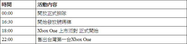 為共同歡慶這個重要的里程碑,台灣微軟特別在台北市新光三越信義新天地香堤廣場打造Xbox One專屬綠地,於9/22晚間六點舉辦Xbox One上市派對,邀請玩家們一起在「One」綠叢中打電動!現場將提供消費者多款Xbox One最新遊戲試玩,而在派對活動中購買Xbox One的早鳥消費者將獲得限量好禮。同時,玩家將有機會與氣質女星張景嵐同台飆速尬車、與「大師兄」林智勝等中職人氣球星及LamiGirls一同挑戰Xbox One最新遊戲!超人氣熱血主播徐展元也將參與現場主持精彩的遊戲PK賽事播報,歡迎所有喜愛Xbox的玩家及消費者們一起同歡,迎接Xbox One正式登台!
