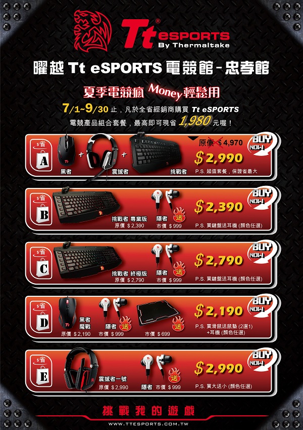 即日起到9月底前,歡迎全國電競迷和玩家蒞臨【曜越Tt eSPORTS電競館-忠孝店】,把握稍縱即逝的難得機會,擁抱Tt eSPORTS趁現在!歡迎前往【曜越Tt eSPORTS電競館-忠孝店】參觀選購,或來電:02-2771-0659;或上網曜越科技官方網站: www.thermaltake.com/default.htm ;Tt eSPORTS官方網站: http://www.ttesports.com.tw/index.aspx