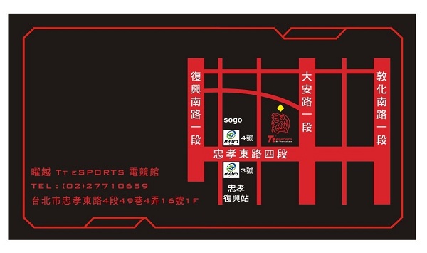 Tt eSPORTS承襲曜越科技不斷接受挑戰和品牌創新思維,秉持「享受娛樂、電競、科技、生活」的企業願景,已於7月8日正式在台北東區繁華地帶開設全台第一家電競配備專賣店- 【曜越Tt eSPORTS電競館-忠孝店】,採用24小時不打烊的消費模式,現場為玩家陳列販售Tt eSPORTS全系列電競商品,消費者隨時隨地前往,並可依據喜好的遊戲種類,包括: 即時戰略遊戲、第一人稱射擊遊戲、與多人角色扮演遊戲等,挑選到專屬的專業電競配備。