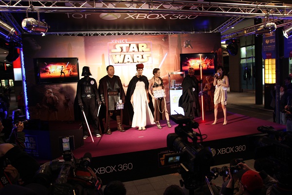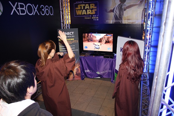 台北場《Kinect星際大戰》上市派對更號召喜愛星際大戰的粉絲們及Xbox 360玩家同樂!現場所舉辦的《Kinect星際大戰》武裝Cosplay大賽,募集到各式各樣富有創意想像的星際大戰粉絲齊聚一堂,有多位星戰迷費盡心思將自己Cosplay成星際大戰電影當中的帝國風暴兵、達斯魔及莉亞公主;還有粉絲大膽的將「Star Wars」字眼剃在頭上,讓整個派對現場熱鬧滾滾,充斥濃濃的星戰氣氛!人氣裝扮王也將《Kinect星際大戰》限量版主機贏回家。同時,現場吸引大批玩家體驗及排隊搶限時優惠,凡購買《Kinect星際大戰》中文版遊戲片即可獲得全球限量《Kinect星際大戰》光劍傘乙支,估計零售價新台幣1,290元。購買《Kinect星際大戰》限量版主機,可獲得光劍傘乙支外,再加贈Xbox 360黑色無線控制器乙支,估計零售價新台幣13,980元。