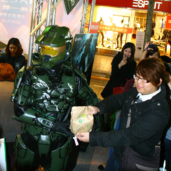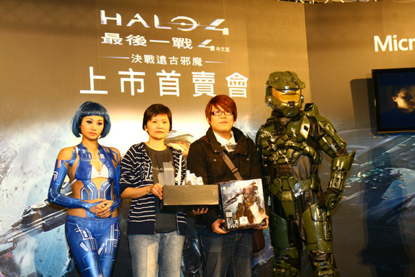 Halo士官長與台灣微軟代表帶來全台第一台《最後一戰4》主機,並將《最後一戰4》首批亮相商品交予第一名排隊消費者。