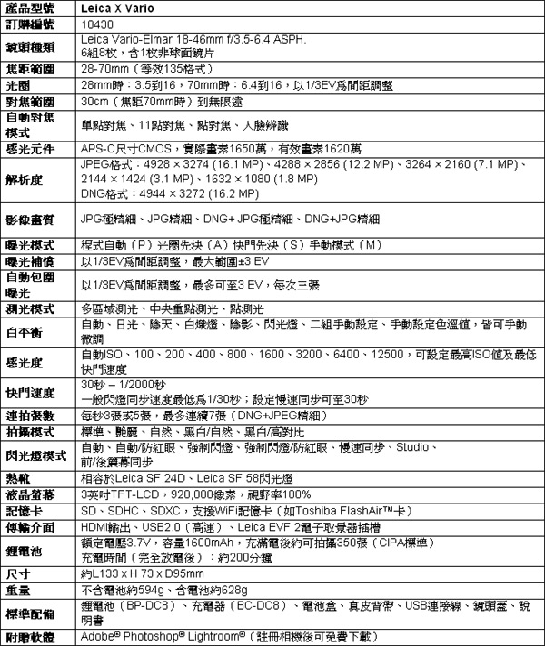 它是市面上第一部配有變焦鏡頭且為APS-C感光元件的頂級輕便型數位相機,其焦距範圍為28至70mm(等效135格式焦距),另外還具有Full-HD高畫質錄影功能,增添更多的功能性及大膽創新概念,Leica X Vario - 來自「德國製造」的頂級徠卡輕便相機。