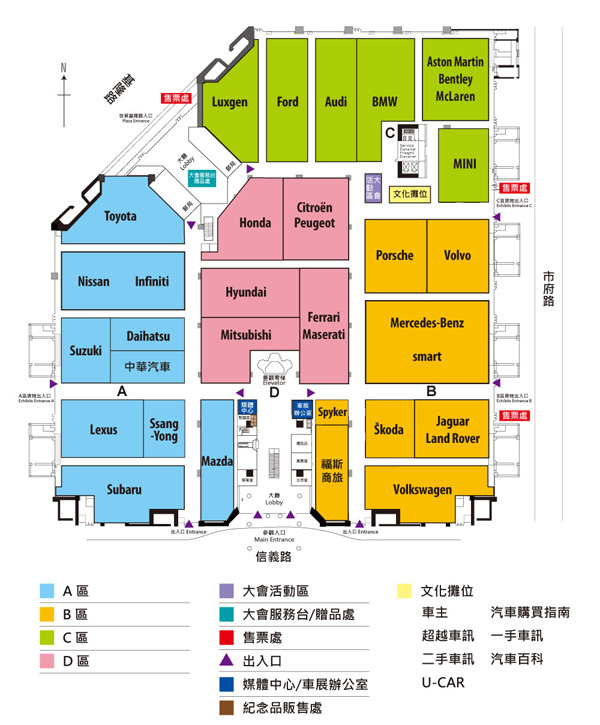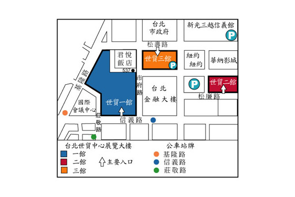 ● 自行開車前往:開車民眾將車輛停放在世貿一館停車場是最方便的了,若車位難尋,不仿將車輛移往世貿三館的2、3樓停車場,或移往松壽路1號的府前廣場地下停車場停放,再步行前往。