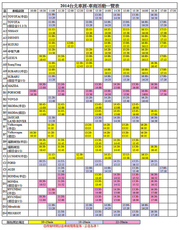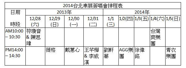 除了欣賞各品牌所邀請的車模、名人之外,台北車展主辦單位也邀請到眾多歌手與樂團,在車展期間的上下午各安排30分鐘的簽唱會,除了看車、看妹之外,耳朵也能享受感官的刺激。簽唱會時段與所屬藝人如以下附表: