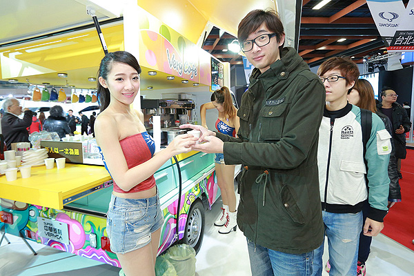 紅藍白的搭配不僅是中華民國國旗的顏色,也是中華汽車LOGO的主色,中華汽車與台灣人民一起打拼奮鬥超過40年,共同見證台灣發展歷程。也因此,中華汽車展現出濃厚的在地情感與愛國精神!1/1元旦當天,車展現場準備一台由中華菱利所改裝的咖啡車,貼心準備暖呼呼的現煮咖啡,由穿著國旗裝的辣妹,現場沖煮給大家喝。這麼難得的活動,一早就吸引超過百位民眾爭相排隊領取,新年第一天就讓車迷們充滿熱力與活力,加足馬力迎接2014的新挑戰。