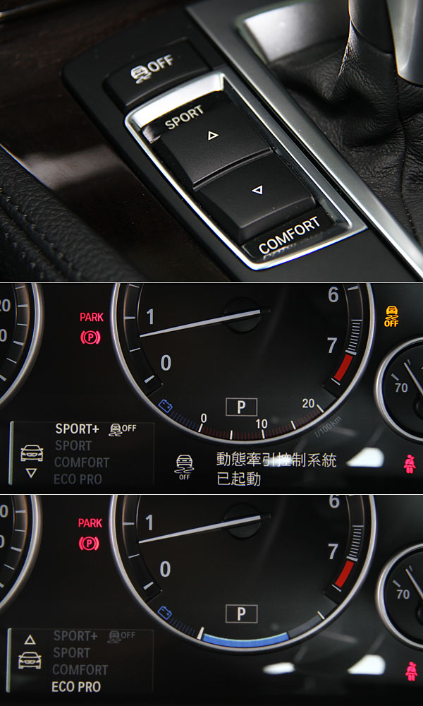 引擎效能的提升,也反應在動態行車模式中,過去僅有提供Normal、Sport與Sport+三種模式的Dynamic Driving Control此系統,於全新引擎科技導入後,也改為Eco Pro、Comfort、Sport和Sport+四種模式,主要差異,莫過於是節能模式的導入;切換至此模式,由於一切為節能考量,不僅將限制動力的輸出反應,儀表還會出現目前駕車動作的節能狀況與煞車動能回收比例等,iDrive中文化螢幕中也會出現節能指數,就連空調系統,也會以最佳效能狀況加以調整,盡可能的讓車輛處於最環保節能的狀態中。