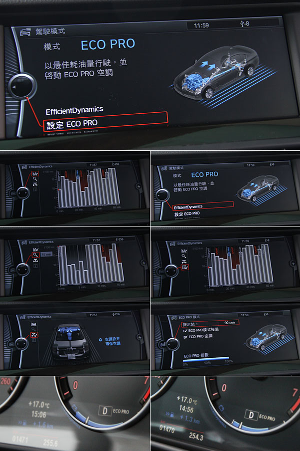 新增加的Eco Pro模式,不僅限制動力的輸出反應,儀表還會出現目前駕車動作的節能狀況與煞車動能回收比例等,iDrive中文化螢幕中也會出現節能指數,就連空調系統,也會以最佳效能狀況加以調整,盡可能的讓車輛處於最環保節能的狀態中。