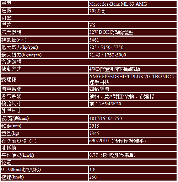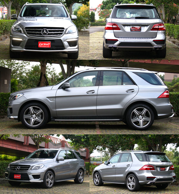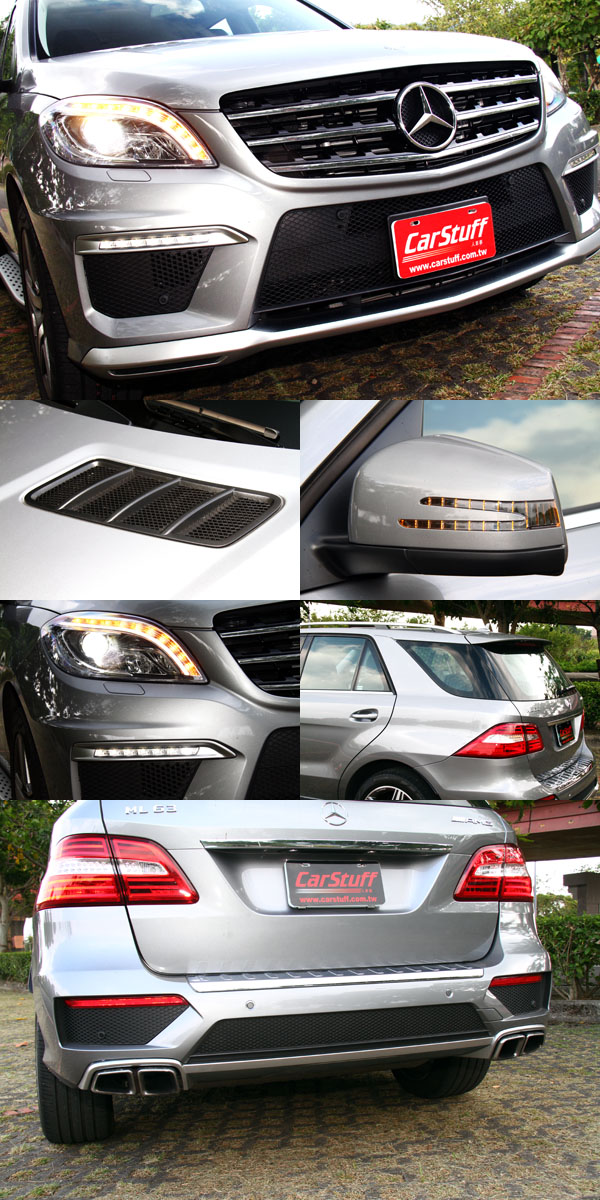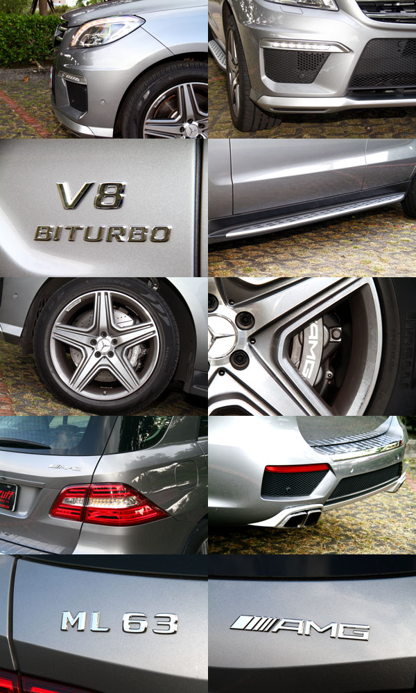 隨著新一代M-Class在台上市,台灣賓士也同步引進高階性能的ML 63 AMG;一如往常的高階AMG車款,ML 63 AMG在原來造型下加上專屬全車空力套件,大型下氣壩強化氣勢,沿著車前下巴擾流片的銳利稜角線條,延伸到車側,與側邊鈑件刻線相互呼應,並且搭配上空力側裙,刻劃出層次感,車尾同樣換上全新保桿,造型飾板與四出排氣管同樣使用梯型元素,搭配出銳利感,胎圈部分則使用20吋5輻輕合金胎圈搭配265/45 R20運動用胎;基本上,ML 63 AMG還是維持了低調中帶著躍動感的風格,不會過度張牙舞爪,卻隱約可以感受到它所蘊含的強大能量。