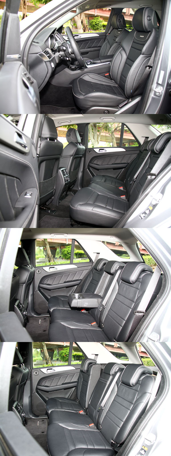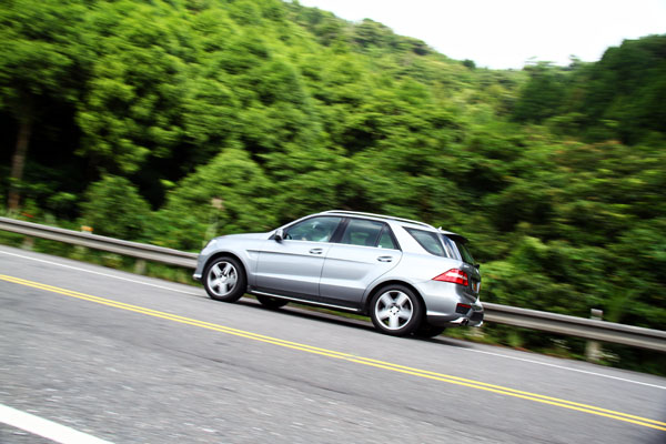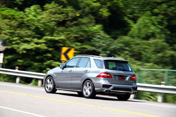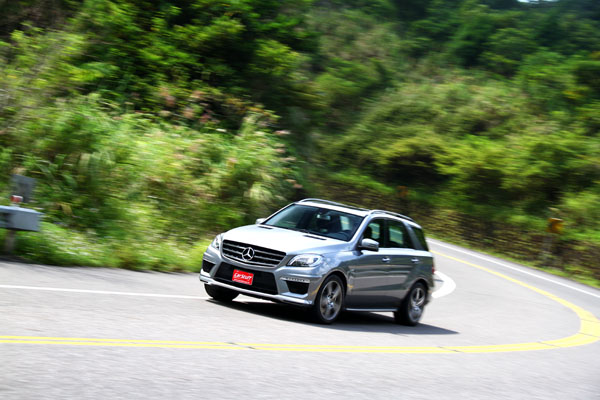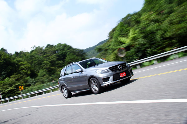 然而當我們離開了市區,在車流量較低的道路上全力衝刺,它立即會像變了身般,將兇猛的動力全數湧出,這時你就會開始尋找電子輔助系統的按鍵,想把變速箱改為運動或手排模式, 以及將AMG跑車化懸吊調硬,以應對強大動力;而且由於車重超過2.3頓,衝刺時的慣性頗為明顯,會將速度感與刺激感放大,當遇到彎道時,一開始會給人較大的恐懼感,但是隨著相處時間加長,逐漸適應它的動態表現後,就會發現它在操控上具有AMG車款該有的水準,同時卻也不會太過躁進,只要順勢將車帶入彎中,重心也就會順勢地轉移,給車輛足夠的循跡性,快速的劃過彎道,當然如果是在窄小的山道上,他的靈活度當然不能與其他高性能車相比,但可掌握度夠高,在山道上奔馳仍可以給與駕駛者足夠的信心;不過,整體來說,ML 63 AMG在高性能SUV領域中,仍是較為收斂的車款,奔放度較不如X5 M或Cayenne Turbo。