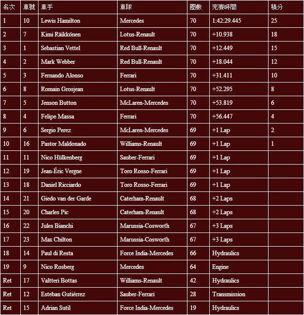 反倒是使用中性胎起跑的Mark Webber,由於策略的運用,甚至一度位居領先。同時在Lewis Hamilton進行最後一次Pit Stop回到賽道時還一度搶在Lewis Hamilton之前。不過,Lewis Hamilton憑藉新胎的優勢迅速超越Mark Webber,並未遭受Mark Webber而讓Sebastian Vettel有拉近距離的機會,自此奠定勝基。