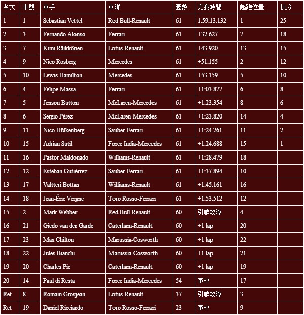 2013 F1新加坡站比賽成績:
