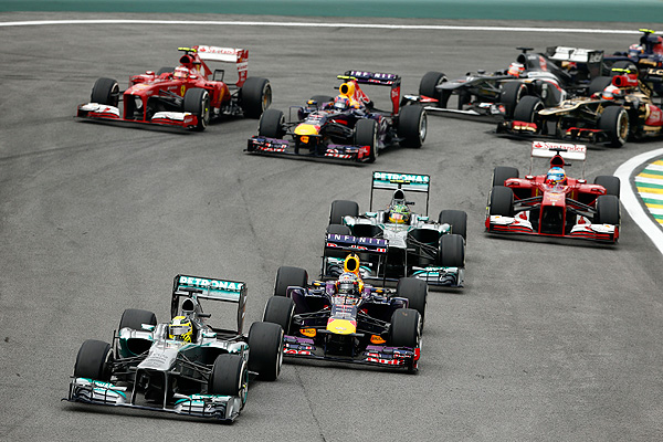 當地時間星期日下午2點,Interlagos賽道上空雖然尚未降雨,但厚重的雲層卻籠罩在賽道上方,呈現一股山雨欲來的氣勢。然而,直到暖胎圈開始仍然未有明顯的雨勢,大會也宣布起跑時仍是以乾地狀態,而沒有打出「Wet Race」的溼地告示牌。22亮賽車就位後,5個紅燈依序亮起。燈滅!2013年F1賽季的最終站巴西站正式起跑,桿位出發的Sebastian Vettel起跑不甚理想,Nico Rosberg趁虛而入、率先通過1號彎,而後方的Fernando Alonso也蠢蠢欲動期望推進名次。