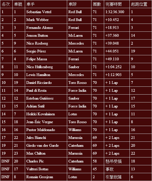 最終,2013年的閉幕戰巴西站便以Sebastian Vettel、Mark Webber、Fernando Alonso的順序依次完賽,巴西站後將離開F1賽場,轉往Porsche的Le Mans團隊發展的Mark Webber以亞軍完賽的成績,更受到眾人的歡呼。受到Lewis Hamilton的事故與Felipe Massa受罰影響,Jenson Butto拿下第4名的位置。而地主則是以第7位完賽,雖然未能以站上頒獎台完成在Ferrari的生涯,但受罰後依然獲的積分,仍屬亮眼的表現。