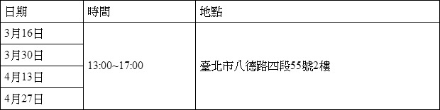 課程日期為3月16日、3月30日、4月13日、4月27日,上課時間為下午一點到五點,地點在中華賽車會的會議室 (台北市松山區八德路四段55號2樓) ,學科部分將由持有國際執照的資深裁判負責講述,結合觀念、規範與實際案例說明,建立新手最基本的賽車運動觀念。