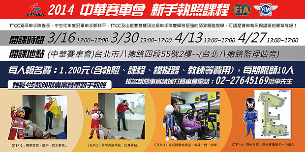 中華賽車會在三月與四月將一連舉辦四場房車新手課程,內容包括賽車規則、旗號、安全要領與賽道行為規範等等,更請到擁有中華賽車會認可的專業教練,指導賽道 駕駛的觀念與技巧,最後還可以透過模擬器做實際的體驗練習,只要通過測試,就能擁有一張新手級執照,馬上就可以報名參加賽車會5月18日在大鵬灣所舉辦的房車新手賽以及獨走賽。