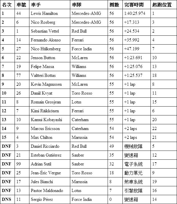 經過56圈的賽事,Lewis Hamilton一掃上一站退賽的遺憾,順利將桿位兌換為個人在2014年的首個分站冠軍。同時,隊友Nico Rosberg也頂住Red Bull Racing車隊的追擊,保住第2名的位置,Mercedes-AMG囊括冠亞軍的結果,為車隊帶回高達43分的積分站上車隊積分榜的首位。而Renault陣營仍無法擺脫首站的低潮,積分榜內僅有Sebastian Vettel與Toro Rosso車隊的Daniil Kvyat兩位車手。Lotus與Toro Rosso各有一輛車分別因為引擎與動力單元的關係退賽,單圈速度也與Mercedes陣營有一段差距,或許還需等待回到歐陸主戰場後的大幅度升級才能拉近距離。