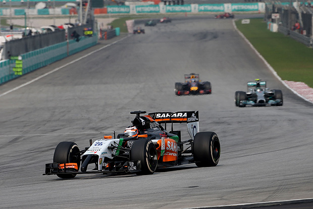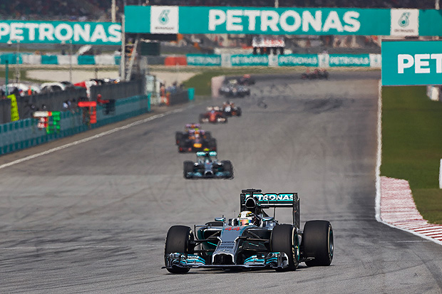 不同於大雨攪局的排位賽,星期日下午Sepang賽道上空僅有些許的雲層,乾燥的賽道讓整場排位賽皆未出現的乾胎有了上場的機會。馬來西亞站的起跑現也不若澳洲站般狀況百出,除了Force India車隊的Sergio Pérez因為變速箱的問題,而無法趕上Pit Lane開放,最後也並未加入起跑外,無論是暖胎圈或是正式起跑,都未有車輛因為熄火而造成起跑延遲,各車隊的可靠性也有相對的提升。