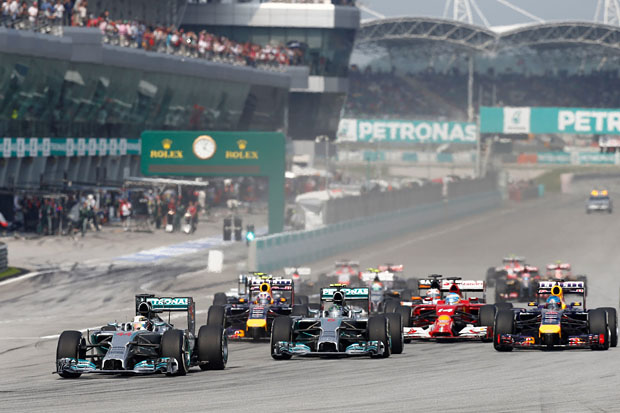 3月30日的正賽當天,雖然擺脫了前日大雨滂沱的惡劣氣候,但仍舊是陰晴不定,不僅偶有雨絲,結束前更是烏雲密布,如此一來,更加考驗了各車隊的策略安排。首先,長達56圈310.408公里的F1正賽在酷熱的天氣中起跑,而從桿位起跑的Lewis Hamilton,展現絕佳速度,燈滅起跑後一路加速,不但守住路線並順利維持領先,連同原本第三位起跑的Rosberg也在一起跑之後就順利卡進Red Bull Vettel行進路線,而晉升一位到第二位。