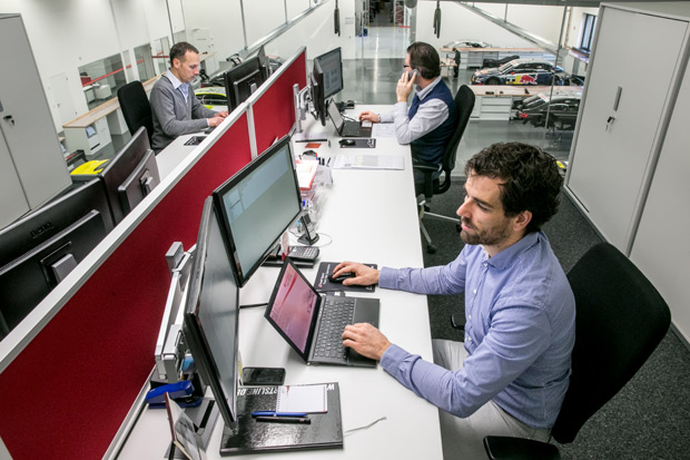 ABT賽車中心一樓作業區、與二樓辦公室之間僅以落地窗相隔,以便清楚掌握作業中的賽車狀態、與即時的整備進度。