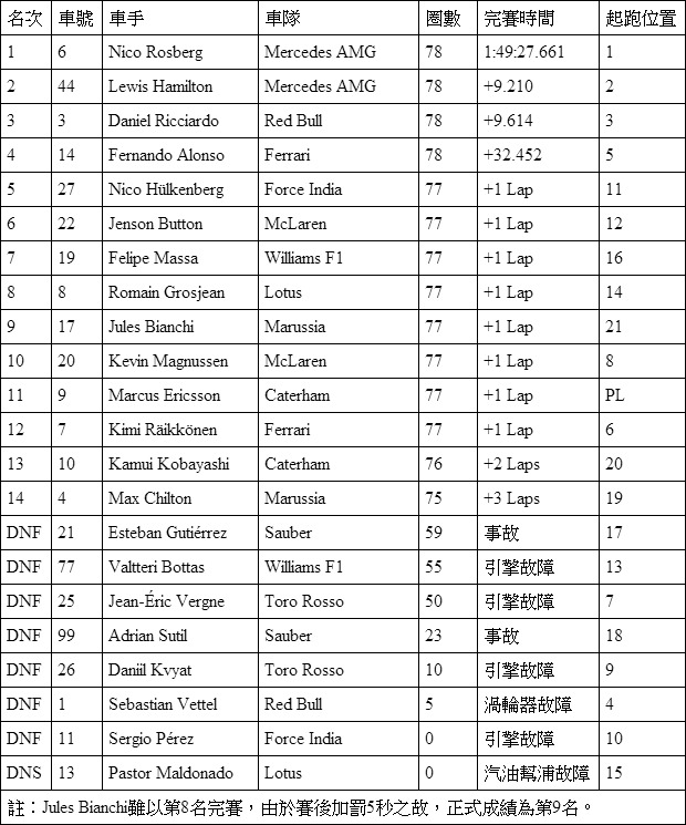 不過,比賽中最令人驚奇的還是Marussia車隊的Jules Bianchi,受惠於Kimi Raikkonen與Kevin Magnussen的事故,Jules Bianchi在方格旗揮下時以第8名的順序通過終點,不過由於Jules Bianchi在Safety Car出勤時進行5秒Stop-and-go的處罰,被賽會判決賽後加罰5秒,但由於與第10位之間的Kevin Magnussen有著超過10秒的差距,依然可以獲得第9名的成績,為個人也為Marussia車隊拿下首個冠軍積分。