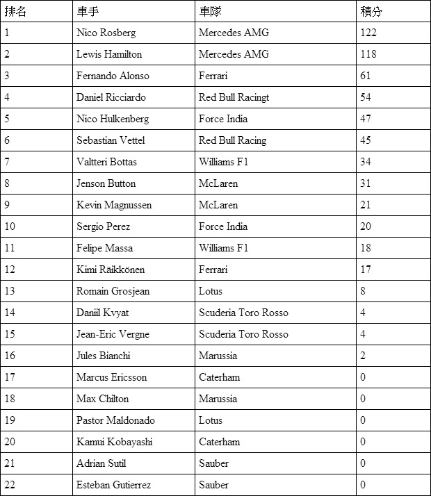 摩納哥站賽後車手積分榜: