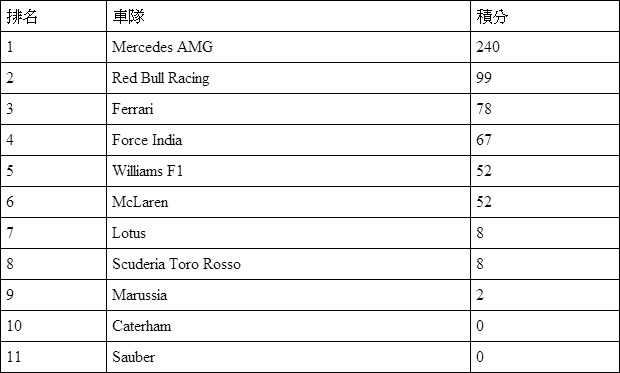 摩納哥站賽後車隊積分榜: