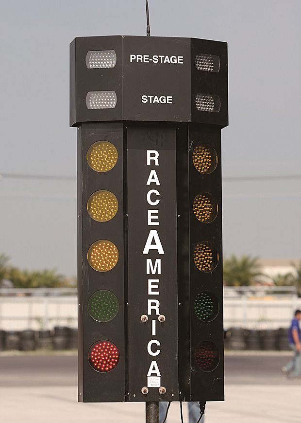 Stage) ,起跑點地面上的感應器會發出兩組光束,車輛當前輪阻斷第一道光束時,聖誕樹最上面的第一顆Pre-Stage白燈會亮起,接著車輛再向前就會阻斷地面上感應器第二道光束,這時候聖誕樹上第二顆Stage白燈也會亮起,表示車輛已就定位準備出發。當左右兩道車輛均到定位,經由裁判長手控啟動,三顆「黃燈」便會接連亮起,接著「綠燈」亮起表示比賽正式開始,此時車輛即可出發,如果車輛在綠燈亮起前就搶先出發,那麼最底下的「紅燈」就會亮起,表示起跑失敗 (偷跑),該趟成績不計。