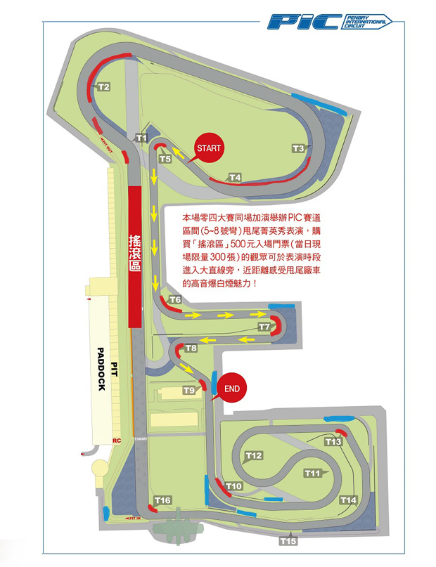 本場大會亦將首創將於PIC賽道5~8號彎道區間依序進行單車表演與多車併甩表演,當天首次開放販售觀眾可購票進入大直線賽道「搖滾區」(票價500元,限量300張),讓您可近距離觀賞感受到甩尾廠車的白煙與高音爆魄力,還可參加幸運試乘體驗抽獎 (限量16位) ,機會十分難得!
