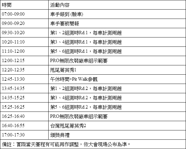 全天活動除了主軸的零四加速、甩尾之外,場外舞台區仍將舉辦億元超跑軍團展示、性感SG攝影會、廠商特賣會與在地美食小吃等豐富活動,現場售票每張250元 (12歲以下幼童免購票,但須由成人家長陪同進場) 。