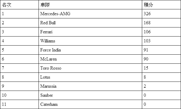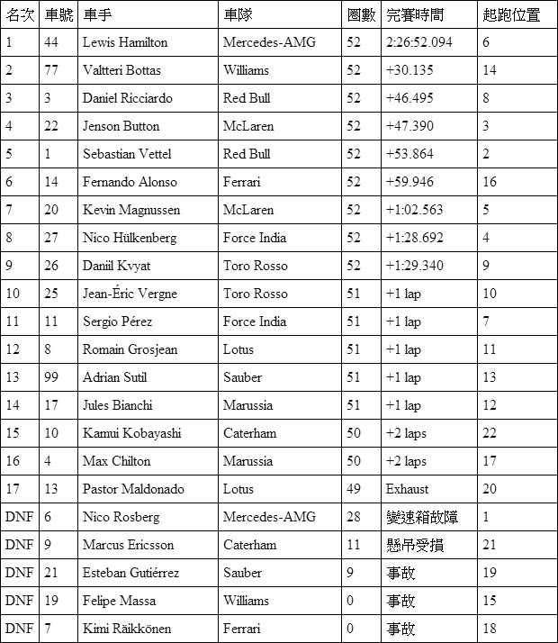 雖然最後場上的焦點多著重在Sebastian Vettel與Fernando Alonso的交戰上,但主場作戰的Lewis Hamilton儘管在賽末還多進站換胎一次,仍舊以30秒的優勢率先接受方格旗揮舞。第14位起跑的Valtteri Bottas則展現了優異的超車技術,奪下分站亞軍而再度站上頒獎台,最後一個頒獎台席位則由表現更趨穩定的澳洲小將Daniel Ricciardo所奪下。