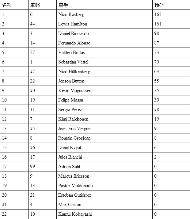 正賽起跑Nico Rosberg順利帶開,反而是第2位起跑的Sebastian Vettel接連位後方車手所超越。